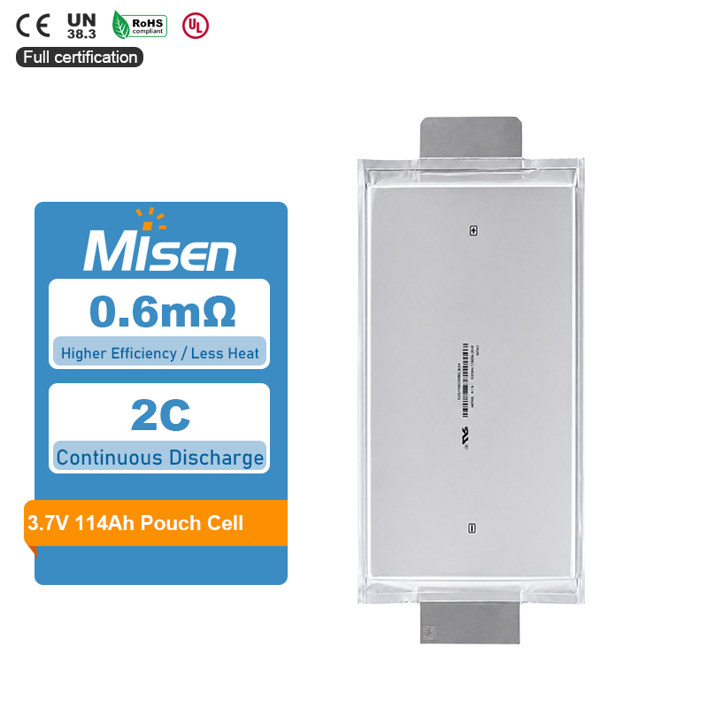 The 3.7V 114Ah NMC lithium-ion pouch cell is a high-capacity rechargeable battery cell designed for EV, ESS, AGV, solar storage and industrial battery pack applications. With large capacity, stable discharge performance and high energy density, it provides a reliable cell solution for OEM battery pack integration and customized energy systems.