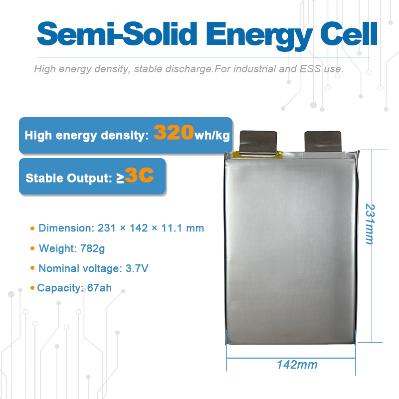 | Energy Storage Systems (ESS) | High capacity (67Ah) supports efficient module design and reduces parallel cell count. The semi-solid electrolyte structure helps improve stability and safety margin for stationary energy storage and backup power applications. |