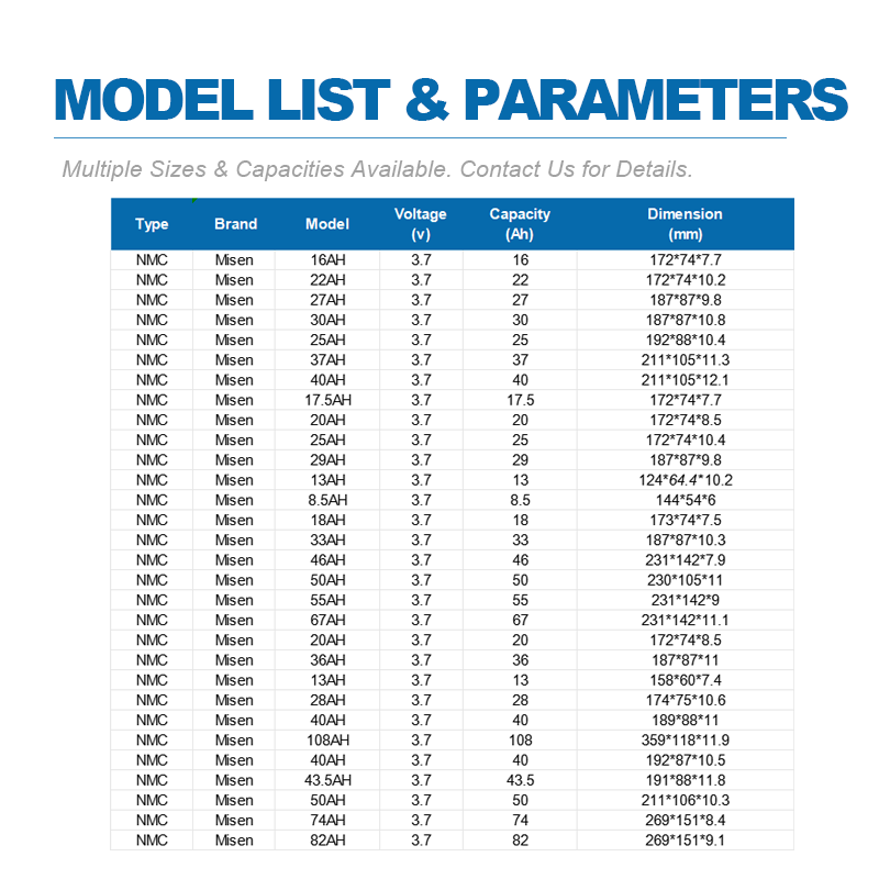 The MISEN semi solid lithium pouch cell (66Ah / 67Ah) is designed for applications that require high energy density, stable output, and an enhanced safety margin. Its large single-cell capacity and semi-solid electrolyte structure make it suitable for battery systems where reliability, consistency, and compact integration are key considerations.
