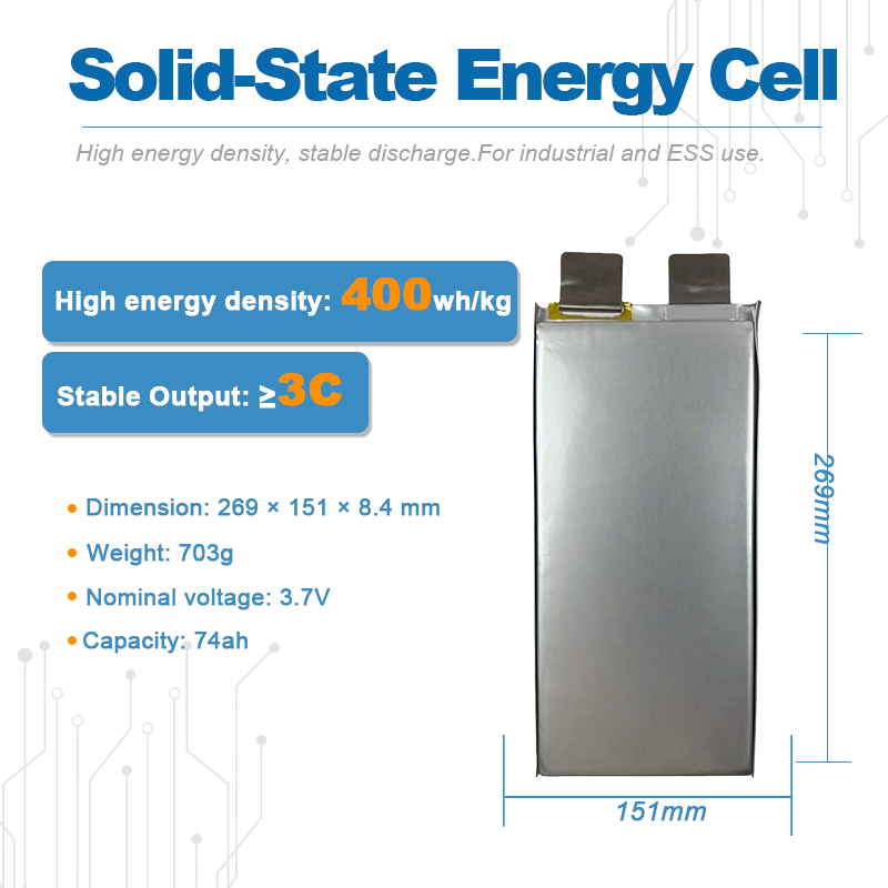 | Energy Storage Systems (ESS) | High single-cell capacity (74Ah) supports efficient module design and reduces parallel cell count. The solid-state / semi-solid electrolyte structure helps improve thermal stability and safety margin for stationary energy storage and backup power applications. |